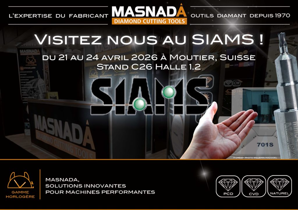 SIAMS 2026 Venez nous rendre visite à Moutier, au salon SIAMS 2026 L’équipe Masnada aura le plaisir de vous accueillir stand n° C26, Halle 1.2 https://www.siams.ch/